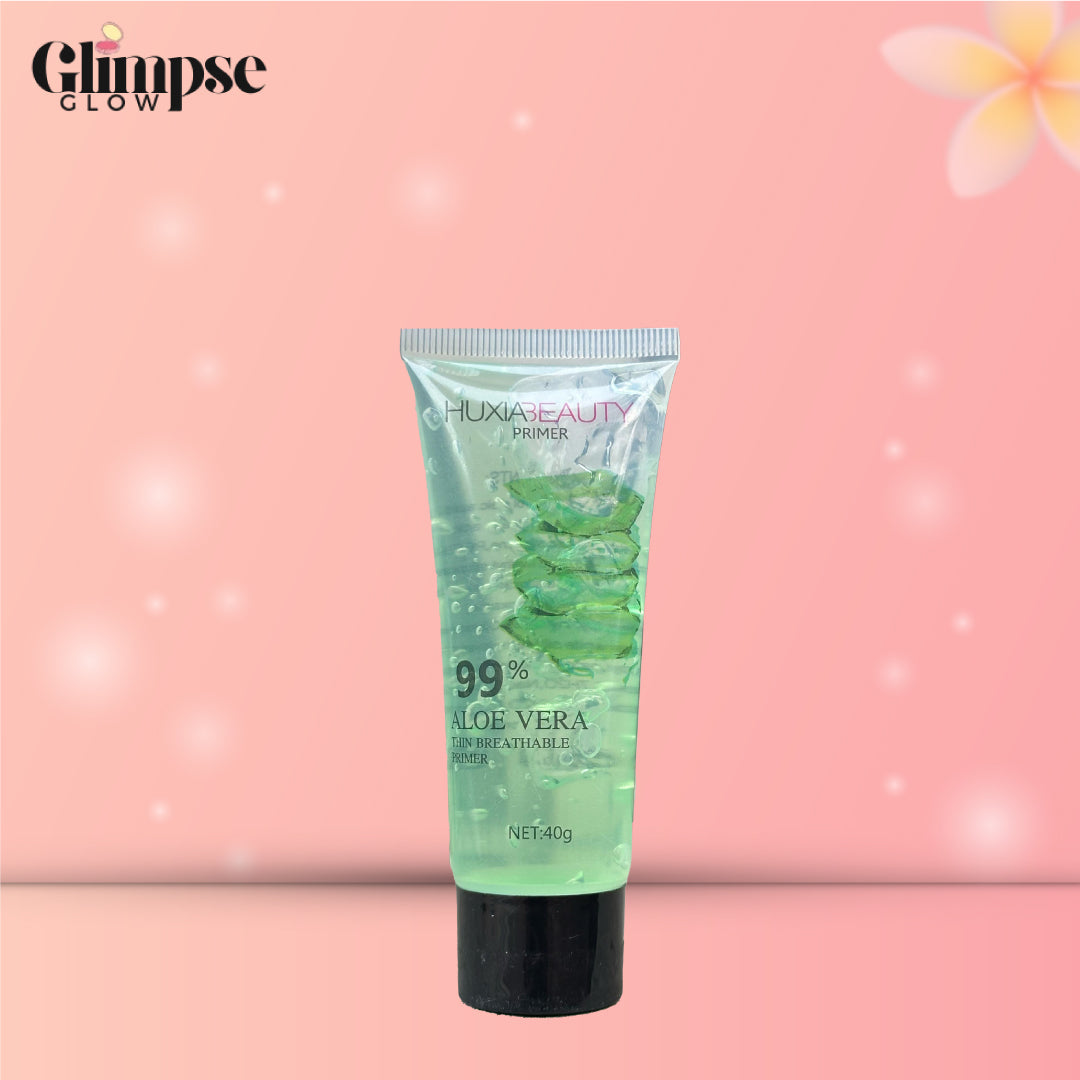 Key items include L'Oréal's Fit Me foundation, a Kaja Magique product, Huda Beauty's primer, a 99% Aloe Vera soothing gel, Ribiabeauty blush, and Emelie Professional's Baked Glow Setting Powder. The image also showcases a "Life Time Perfect" product, possibly a foundation or concealer, and another "24 Hour Perfect" item, suggesting long-lasting wear.