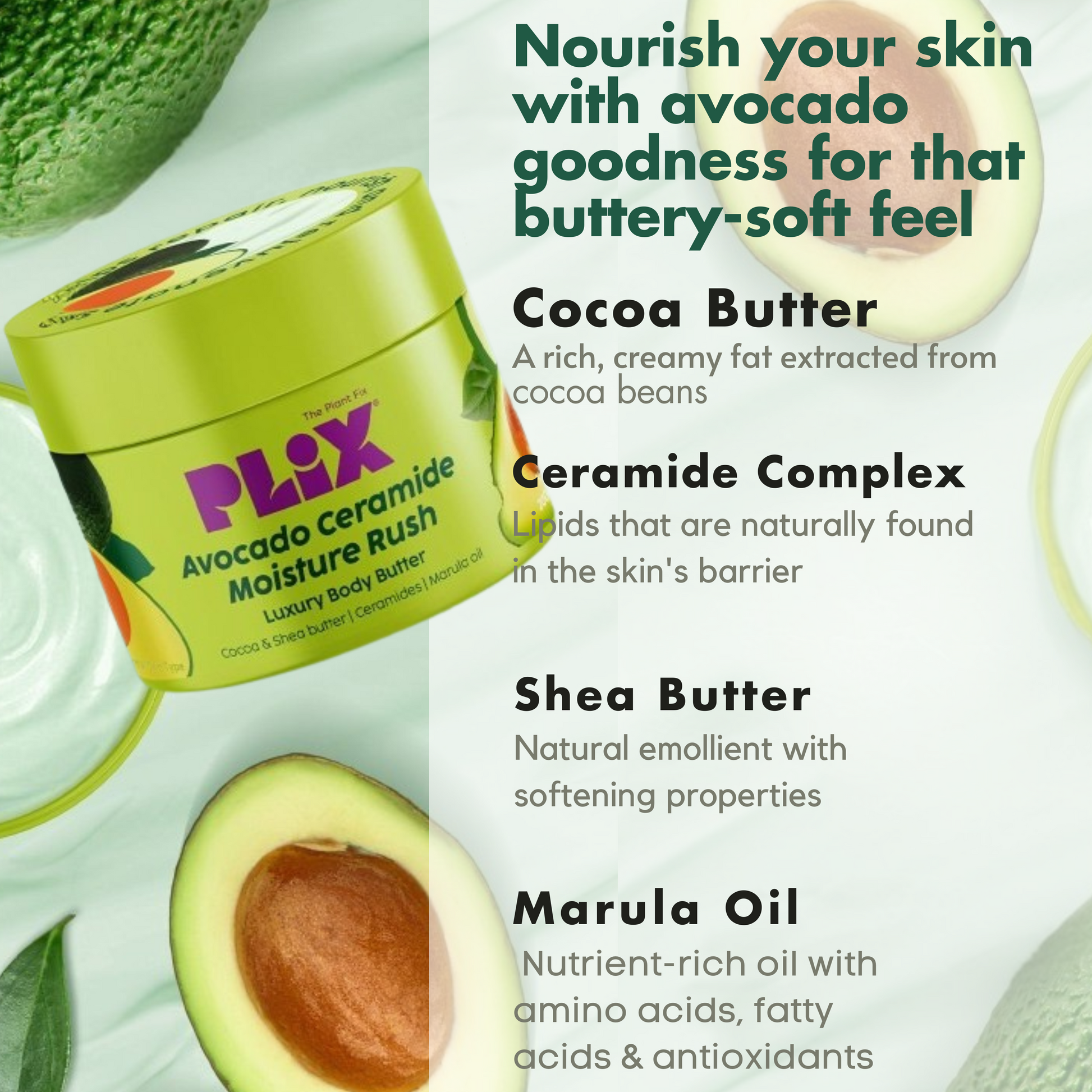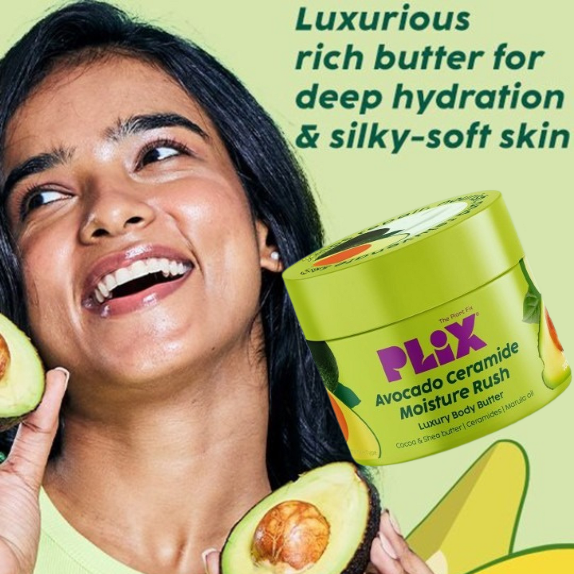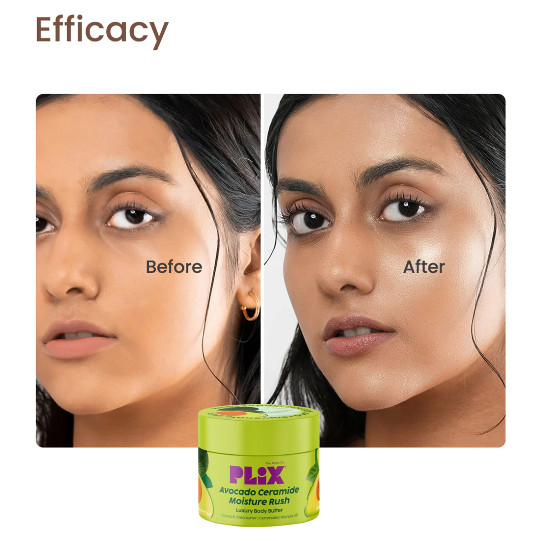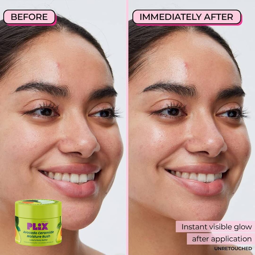 Pamper your skin with Plix Avocado Ceramide Moisture Rush Luxury Body Butter—your go-to solution for irresistibly soft, hydrated, and radiant skin!