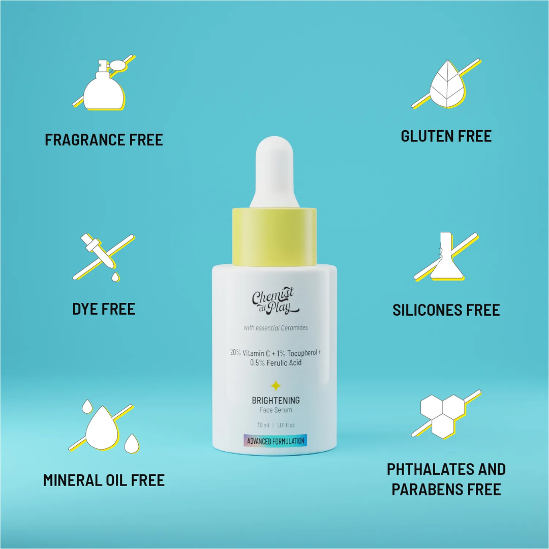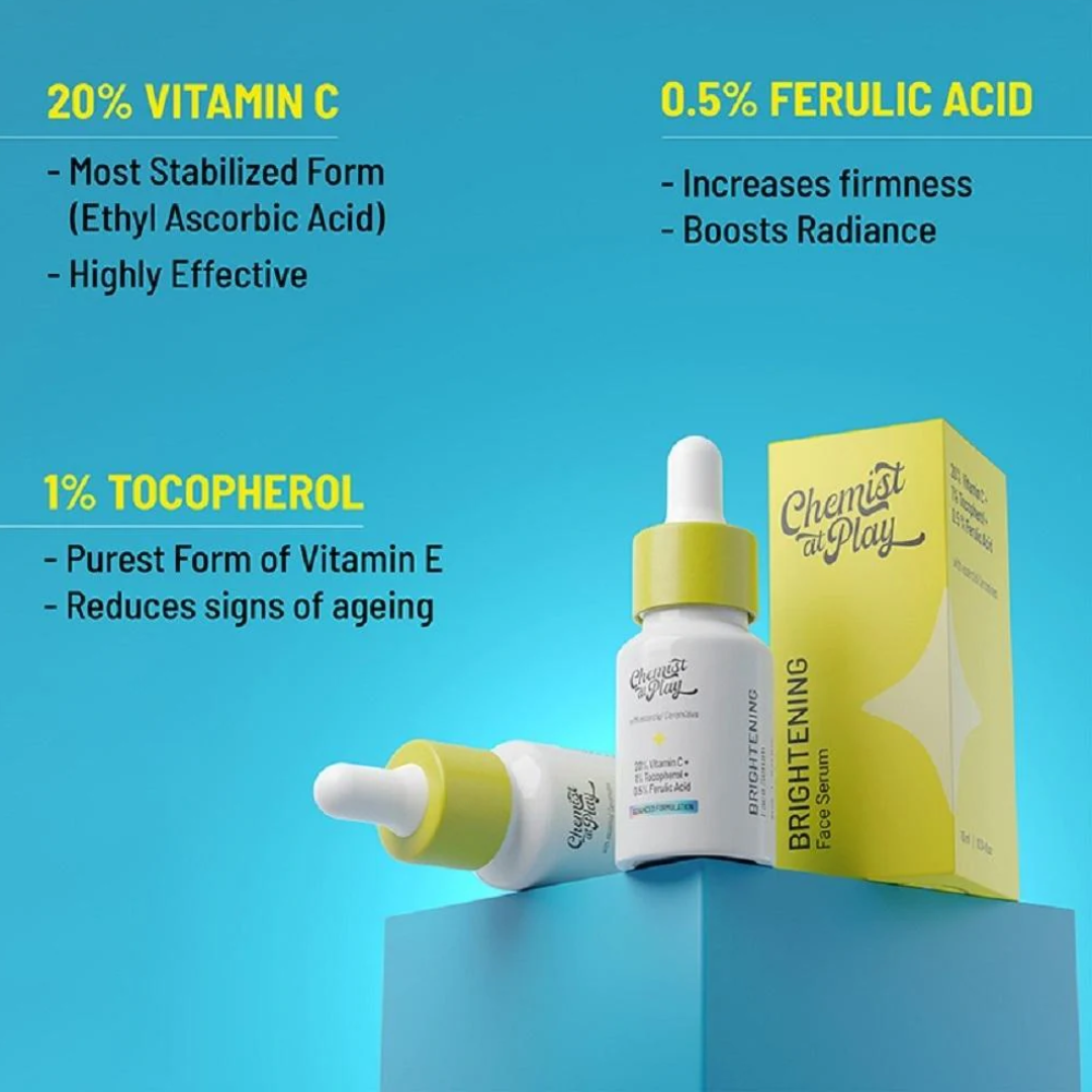 Tired of dark spots, dullness, and uneven skin tone? Get clinical-grade results at home. Introducing the Chemist at Play 20% Vitamin C Brightening Serum, an advanced, potent formulation powered by a stabilized Vitamin C complex. Clinically tested to visibly reduce dark spots and significantly improve overall skin radiance in just 7 days, this serum is your fast-track to a brighter, firmer, and more youthful complexion.