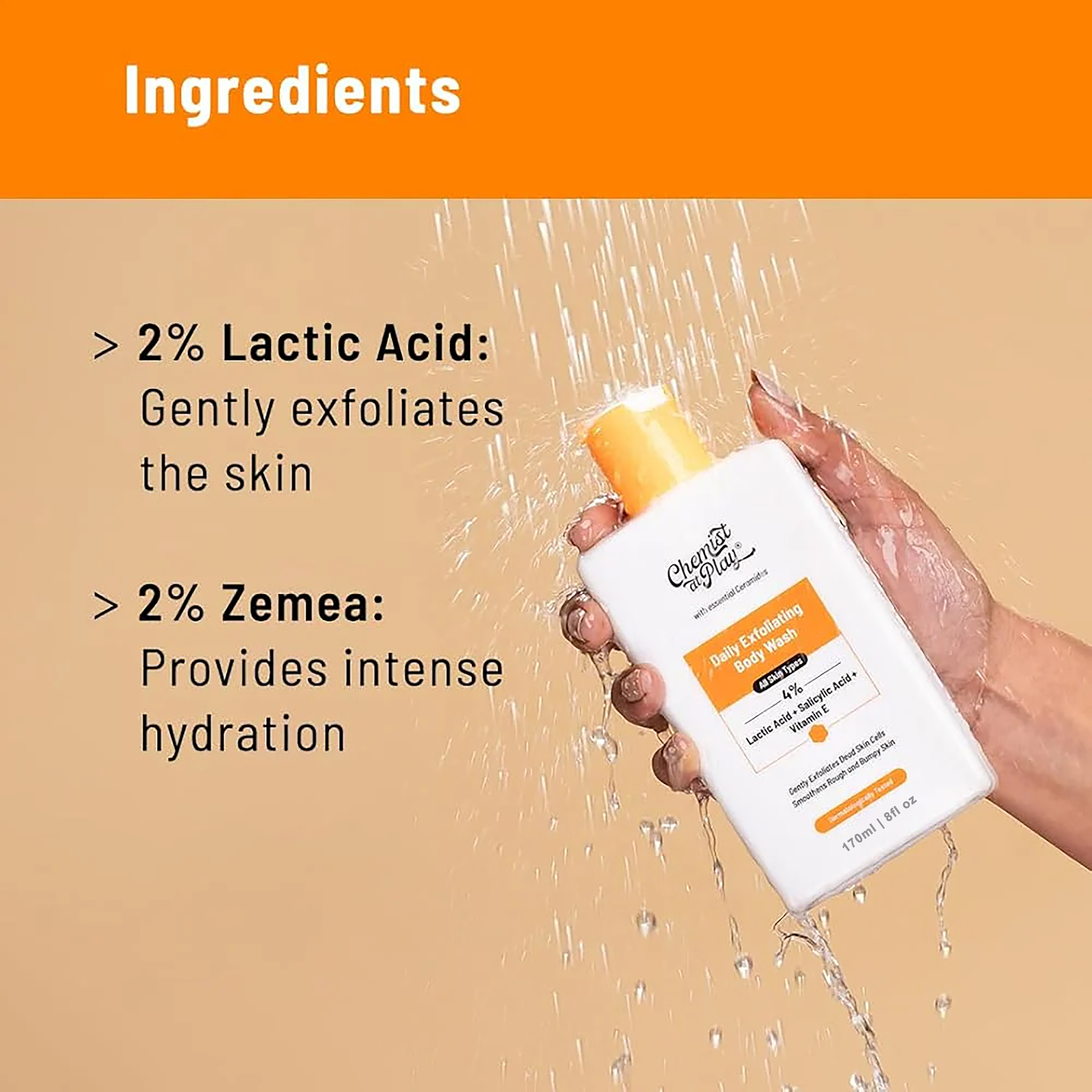 Say goodbye to stubborn tan, rough texture, and bumpy skin with Chemist At Play Daily Exfoliating Body Wash. This dermatologist-tested formula combines 4% lactic acid + salicylic acid + vitamin E to gently slough away dead skin cells, even out skin tone, and reveal brighter, softer skin with every wash.