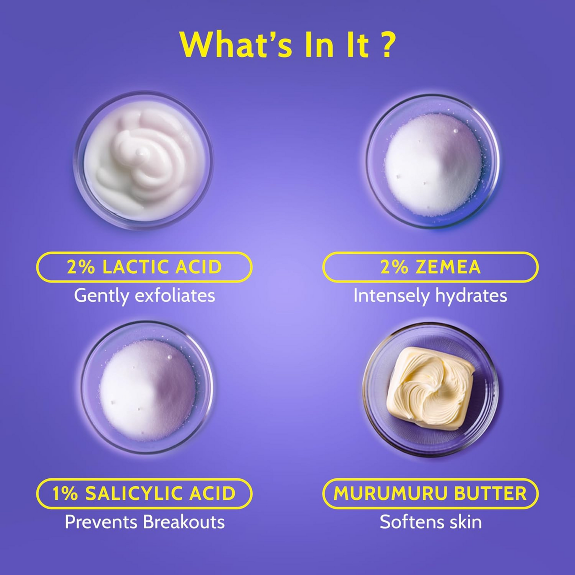- Gentle Yet Effective Exfoliation – 2% lactic acid + 1% salicylic acid dissolve dead skin without irritation.