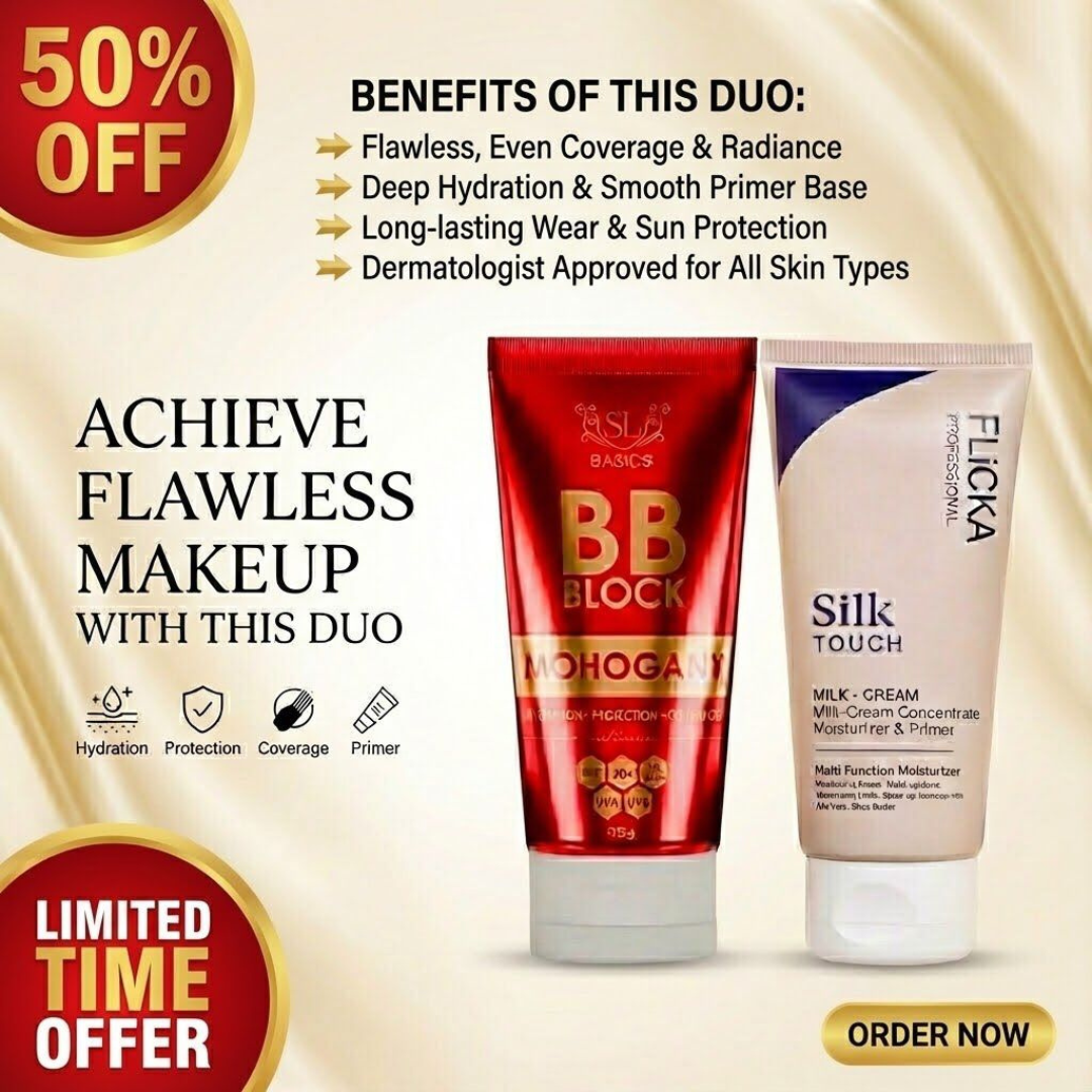 Achieve a naturally flawless complexion with the Flicka Flawless Base Duo, featuring the Silk Touch 3-in-1 Primer and BB Block Cream with SPF 50+. This dynamic duo combines deep hydration, pore-blurring priming, and sun protection with buildable, high coverage that evens skin tone, conceals scars, and delivers a radiant, second-skin finish. Enriched with Shea Butter, Vitamin C, Aloe Vera, Coconut Oil, and Collagen, this kit moisturizes, protects, and perfects—all while being dermatologist-approved for all skin types. Over 10,000 happy customers love its lightweight, non-greasy feel and long-lasting wear.