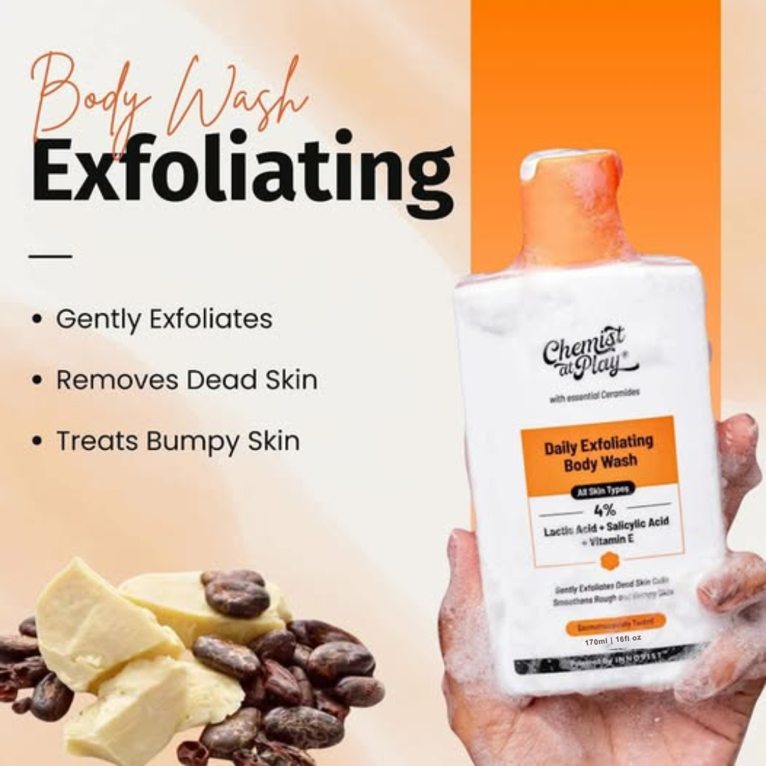 Reveal smoother, brighter, and visibly rejuvenated skin with the Chemist At Play Daily Exfoliating Body Wash. Powered by a potent 4% blend of Lactic Acid and Salicylic Acid, this daily body wash gently exfoliates dead skin cells, unclogs pores, and targets rough, bumpy skin—all while being enriched with Vitamin E and Murumuru Butter to moisturize and protect your skin’s barrier.