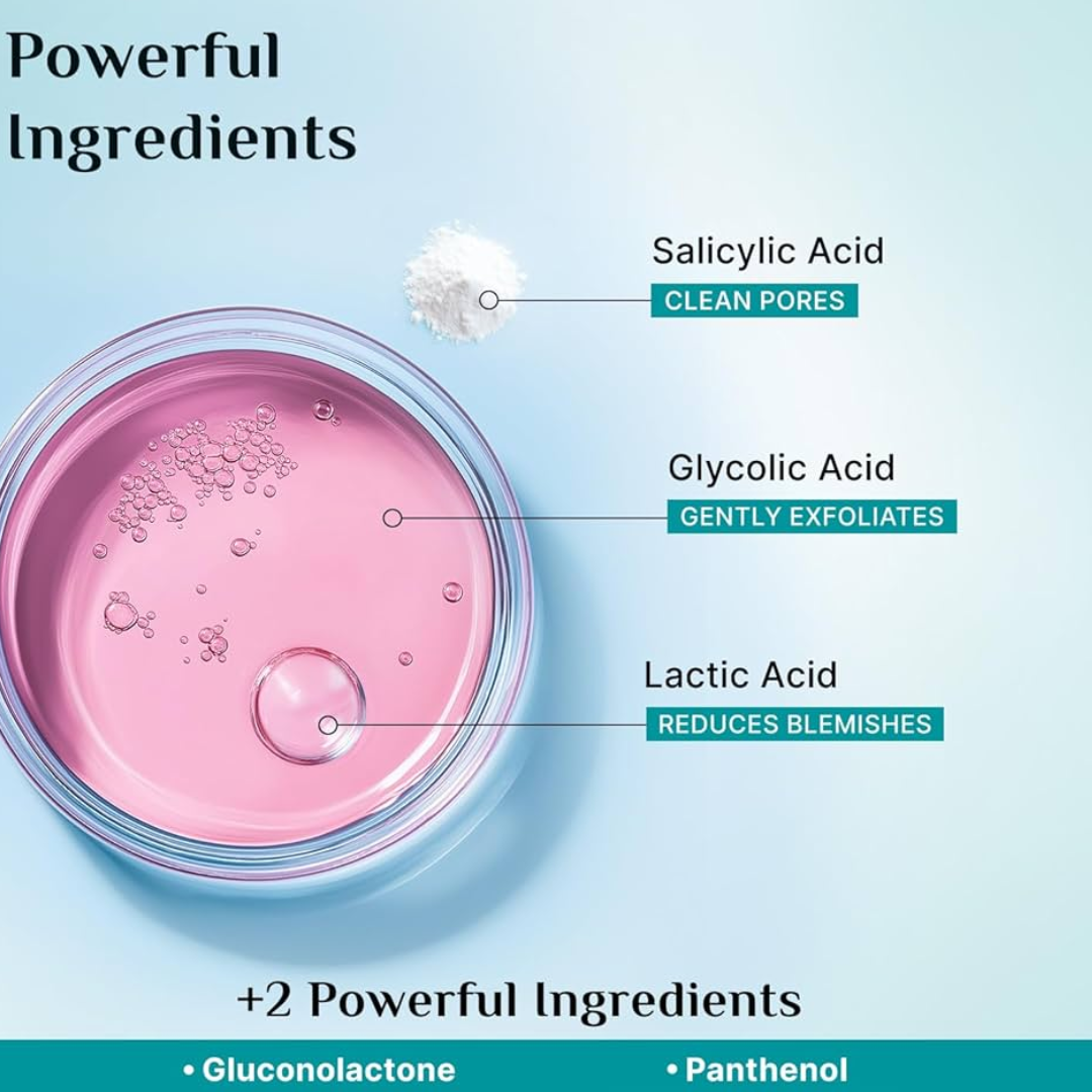 - Deep Exfoliation – AHAs + BHAs dissolve dead skin cells, unclog pores & prevent acne.